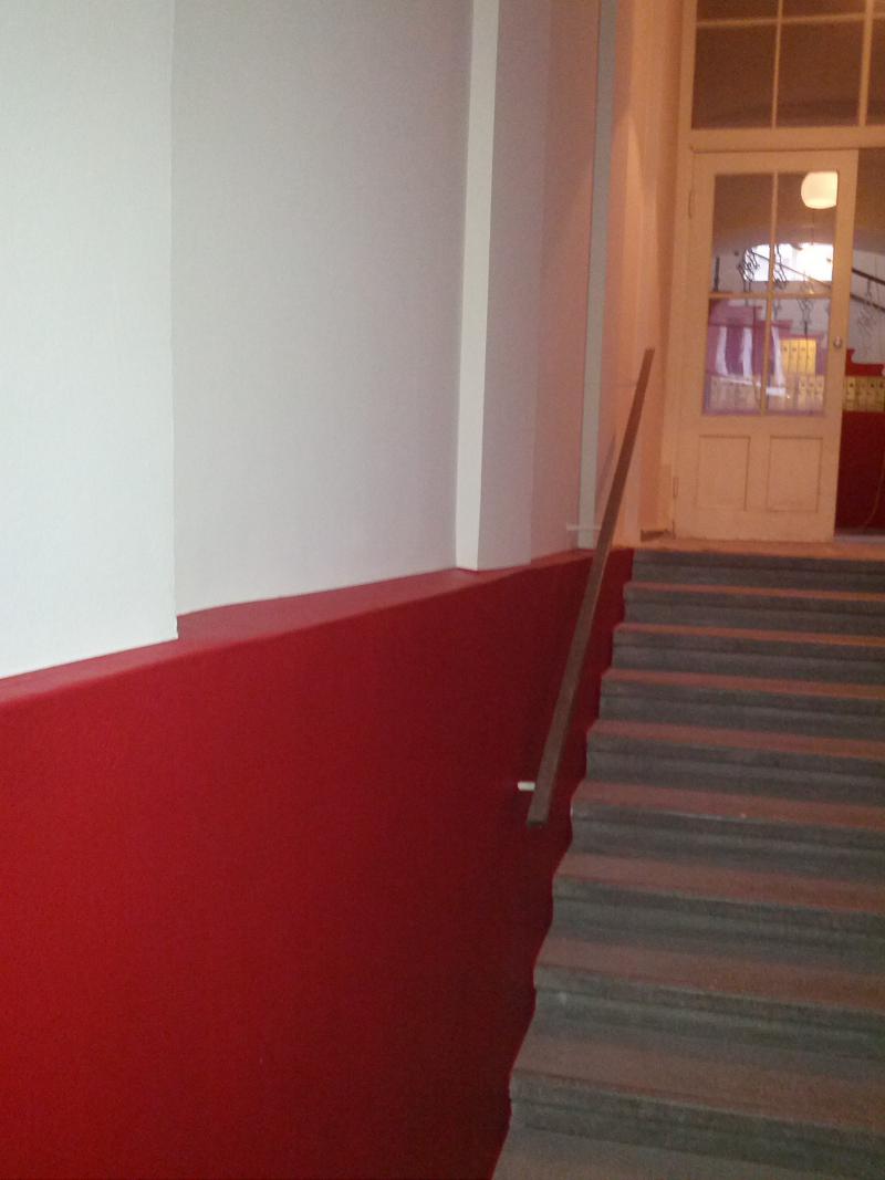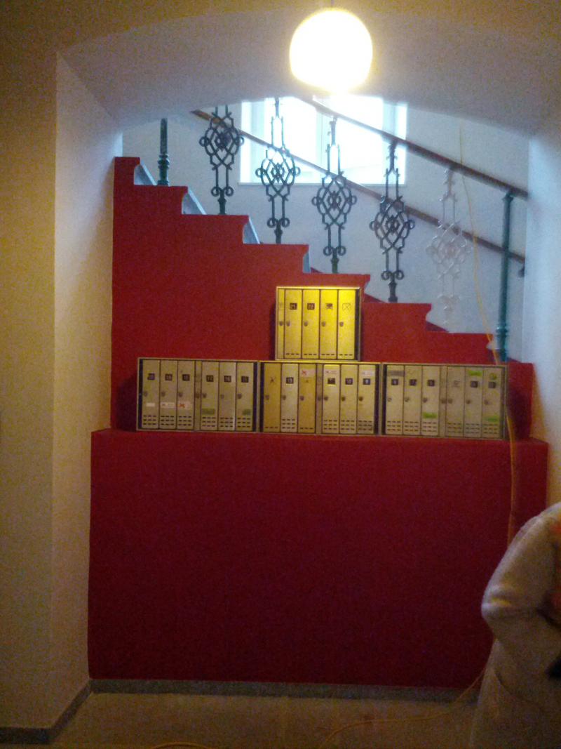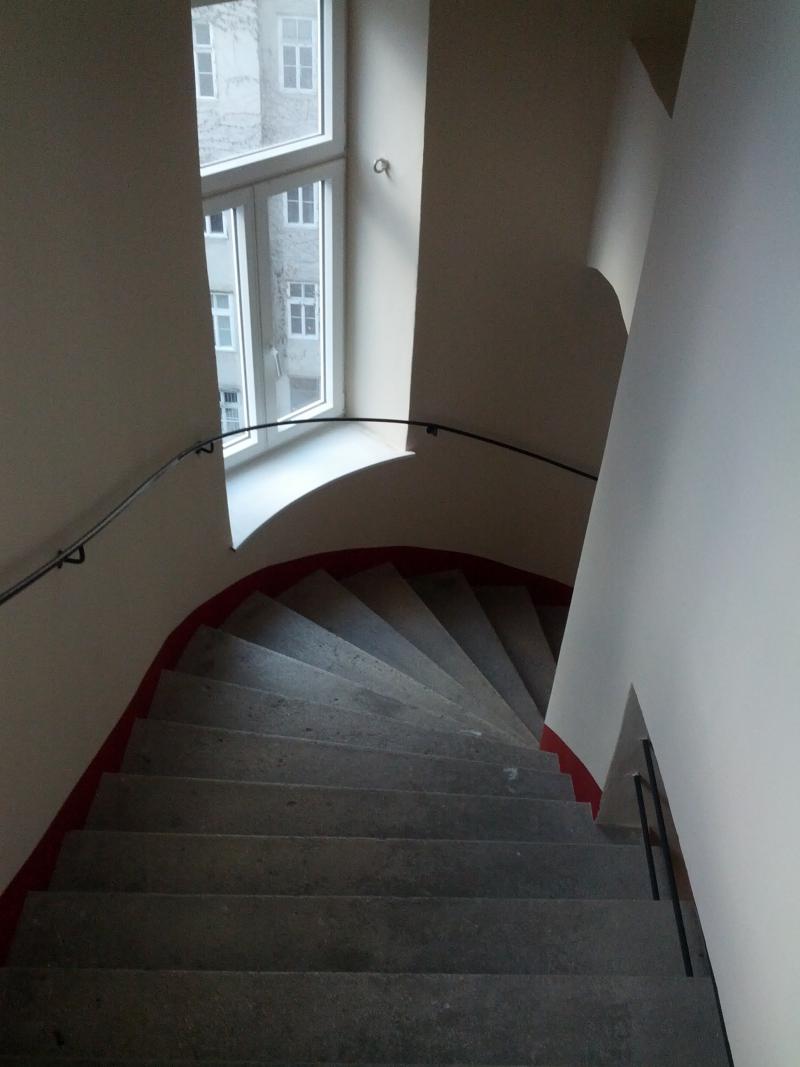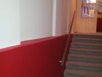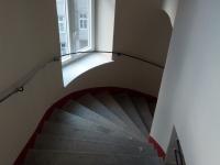 Im Zuge der Sanierung wurden im Stiegenhaus die Kastenfesnter gegen 2-fach isolierverglasten Kunststofffenster getauscht. Die Wandflächen der Gänge und des Stiegenhauses, Handläufe und Wandhalterungen haben eine neue Beschichtung erhalten. Im Eingangsbereich wurde eine alte Lüftungsöffnung zum Keller wiederhergestellt und die dortige Werksteinplatte mit einer Epoxyharzbeschichtung überzogen.