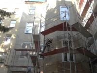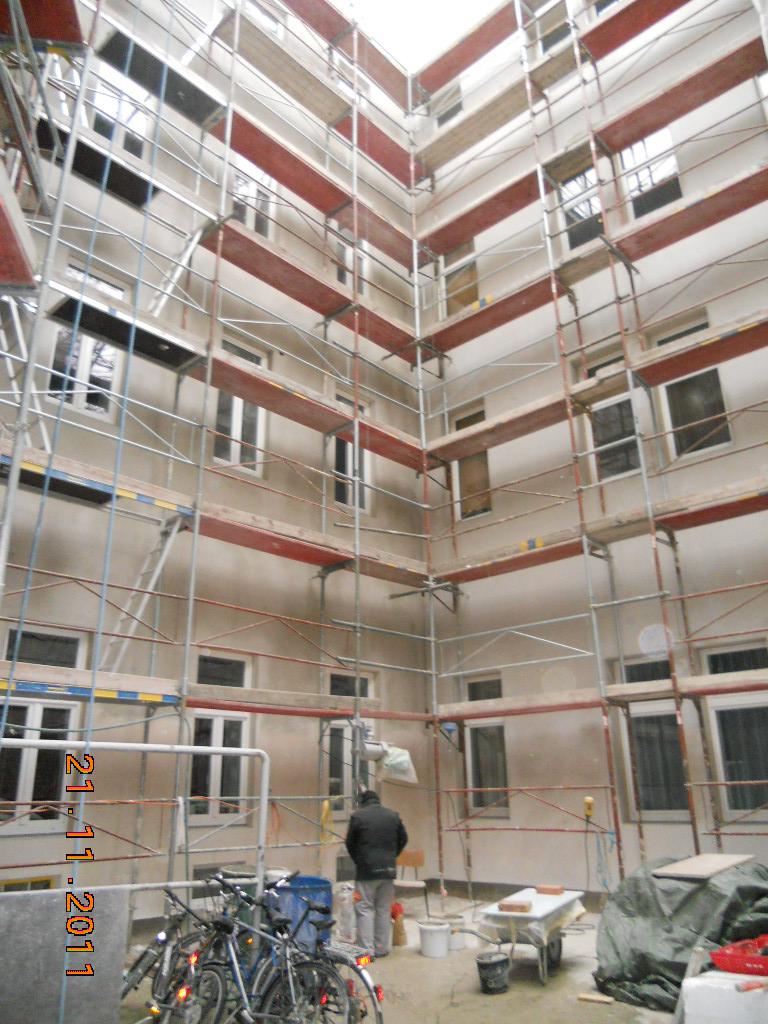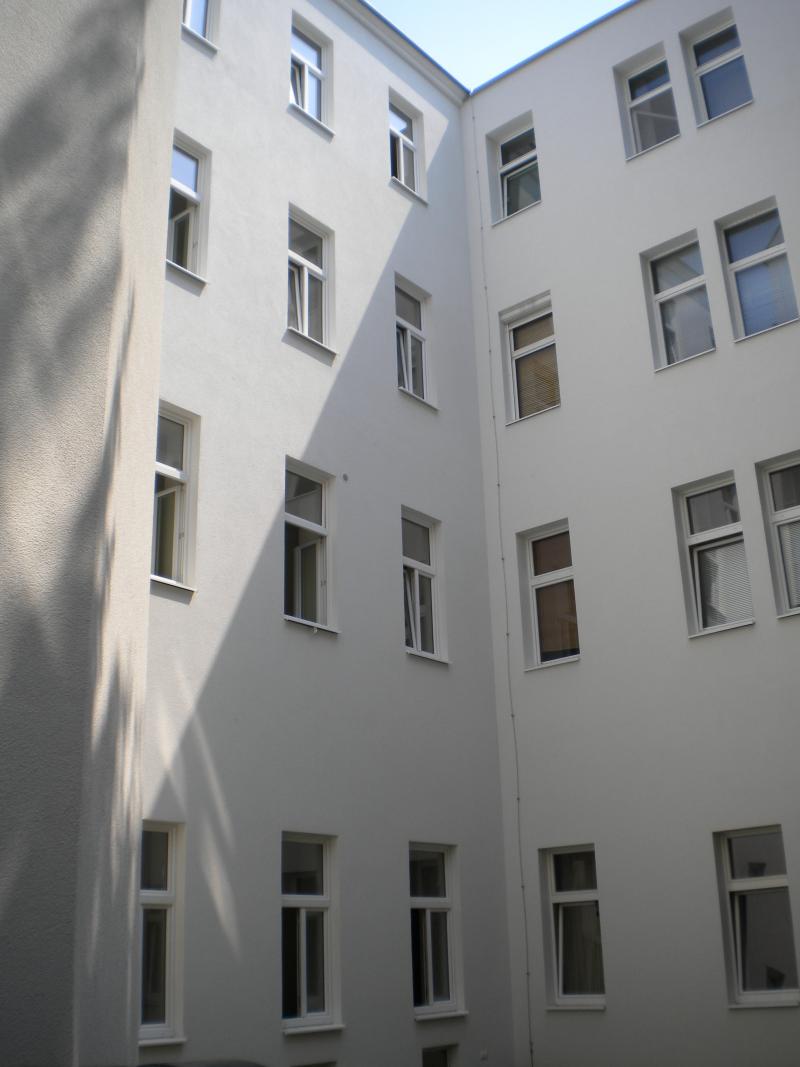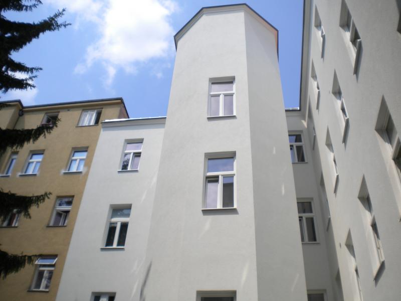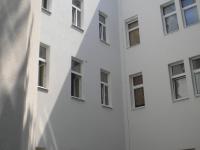 Um das Fassadenbild als auch die thermische Eigenschaft der Außenwände des Hauses zu verbessern, wurde im Innenhof eine Vollwärmeschutzfassade angebracht und alle hofseitigen Fenster ausgetauscht.